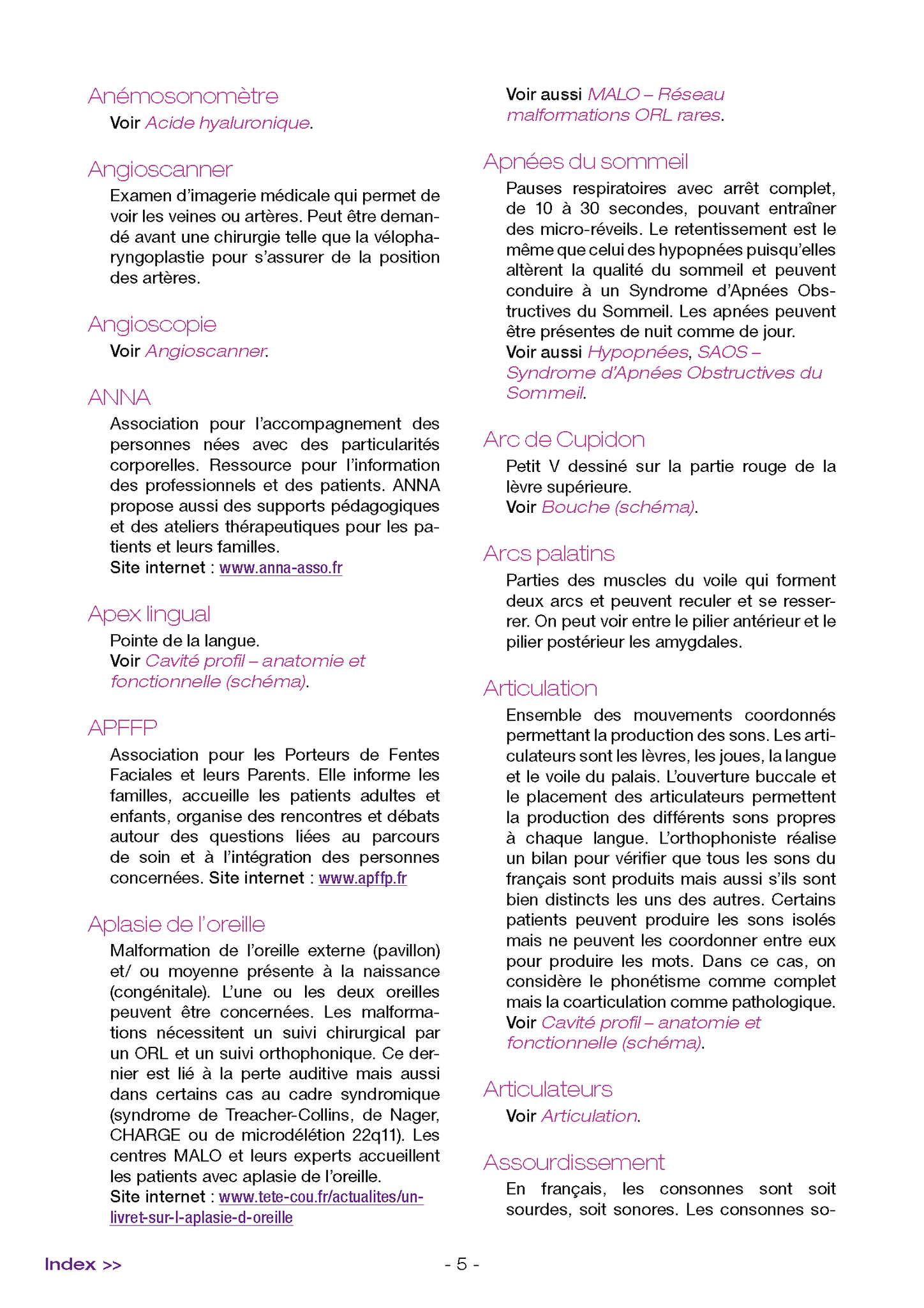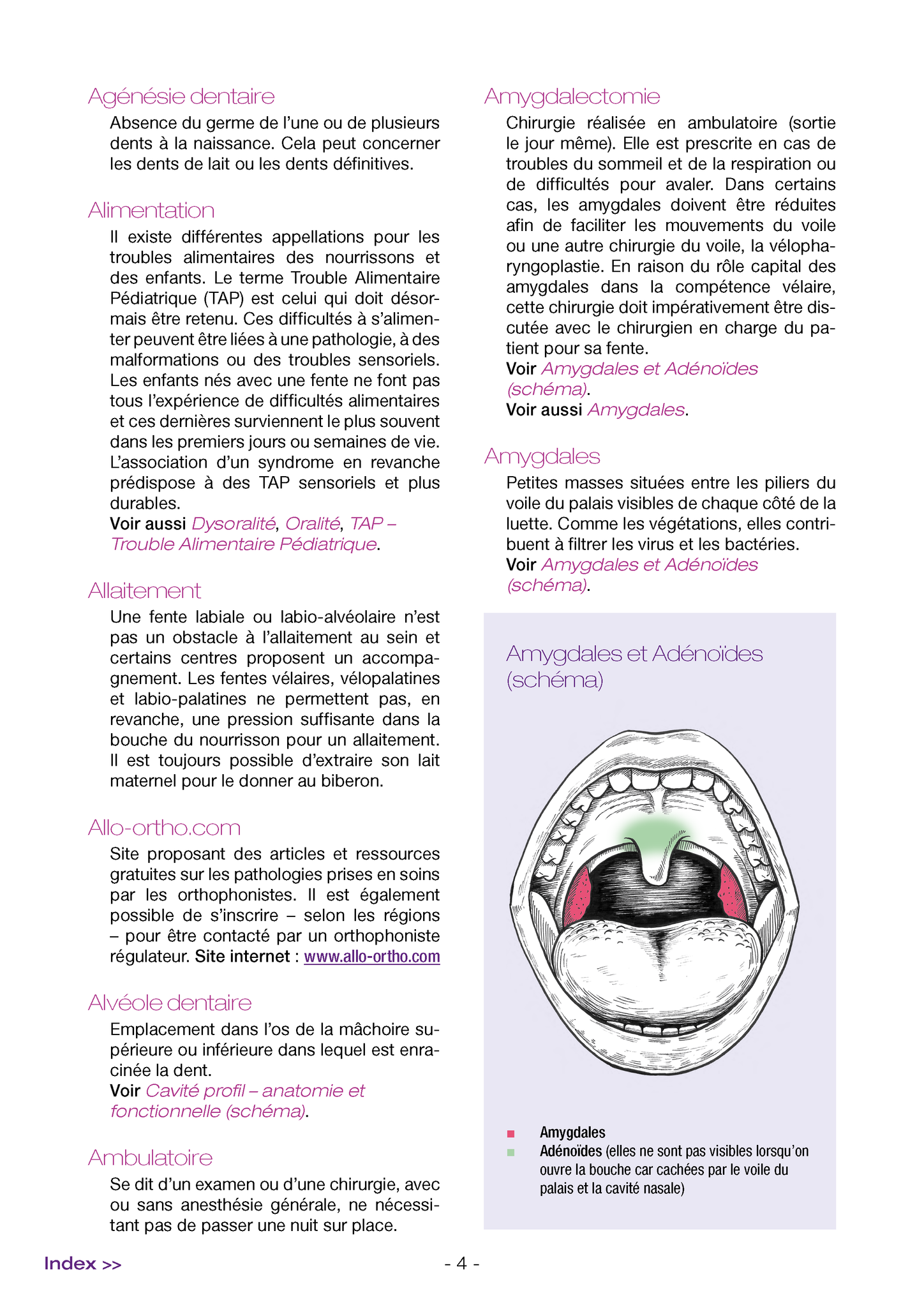 Le dictionnaire contient des termes médicaux, chirurgicaux, orthophoniques ou orthodontiques pouvant être utilisés lors de consultations ou dans les compte-rendus envoyés aux familles et aux professionnels de santé.