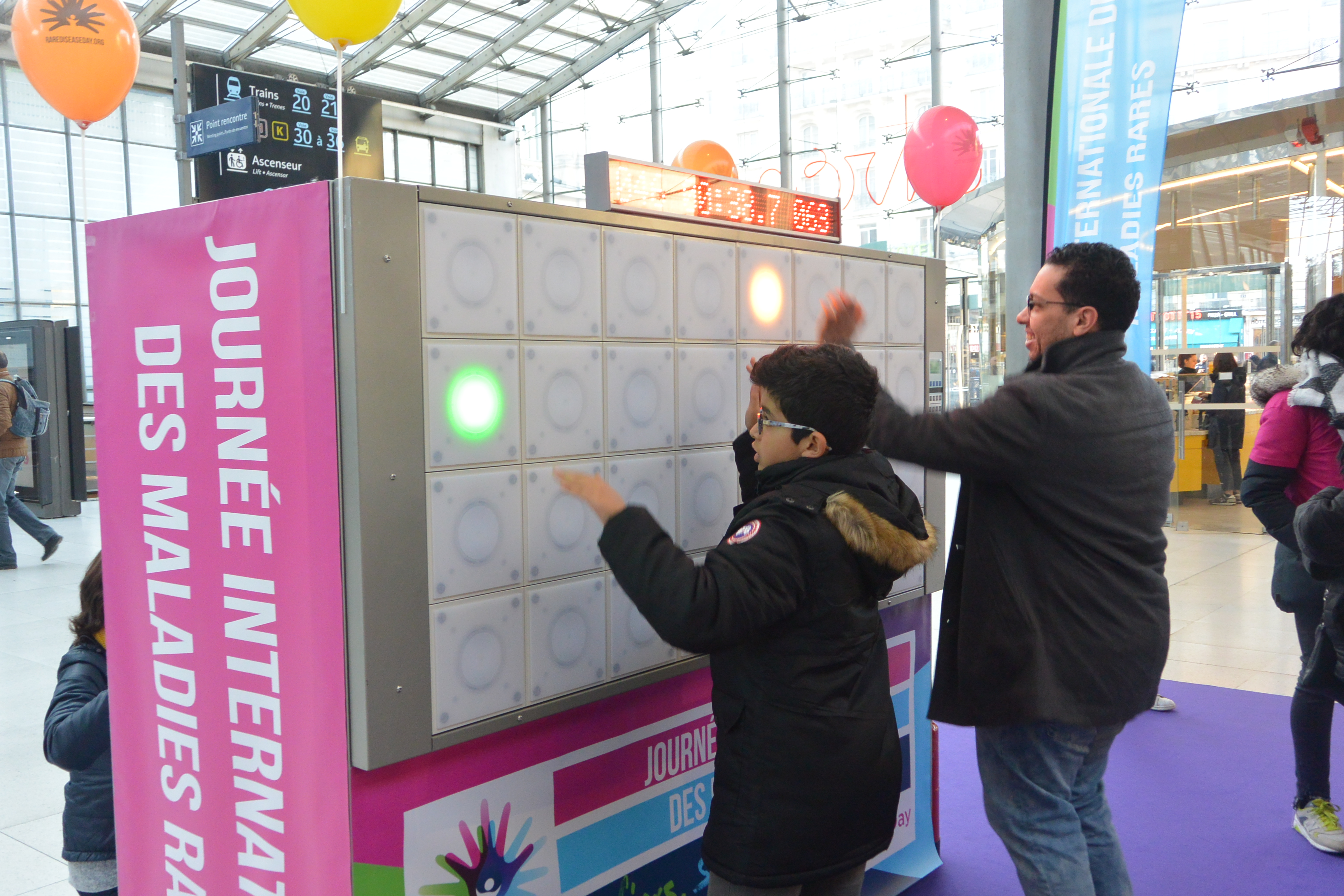 Au programme : sensibilisation aux problématiques des maladies rares avec les acteurs présents à travers des animations et des rencontres. Gare du Nord, le public a pu tester ses réflexes sur un mur lumineux digital, et dans les 4 gares témoigner de sa solidarité sur des fresques.