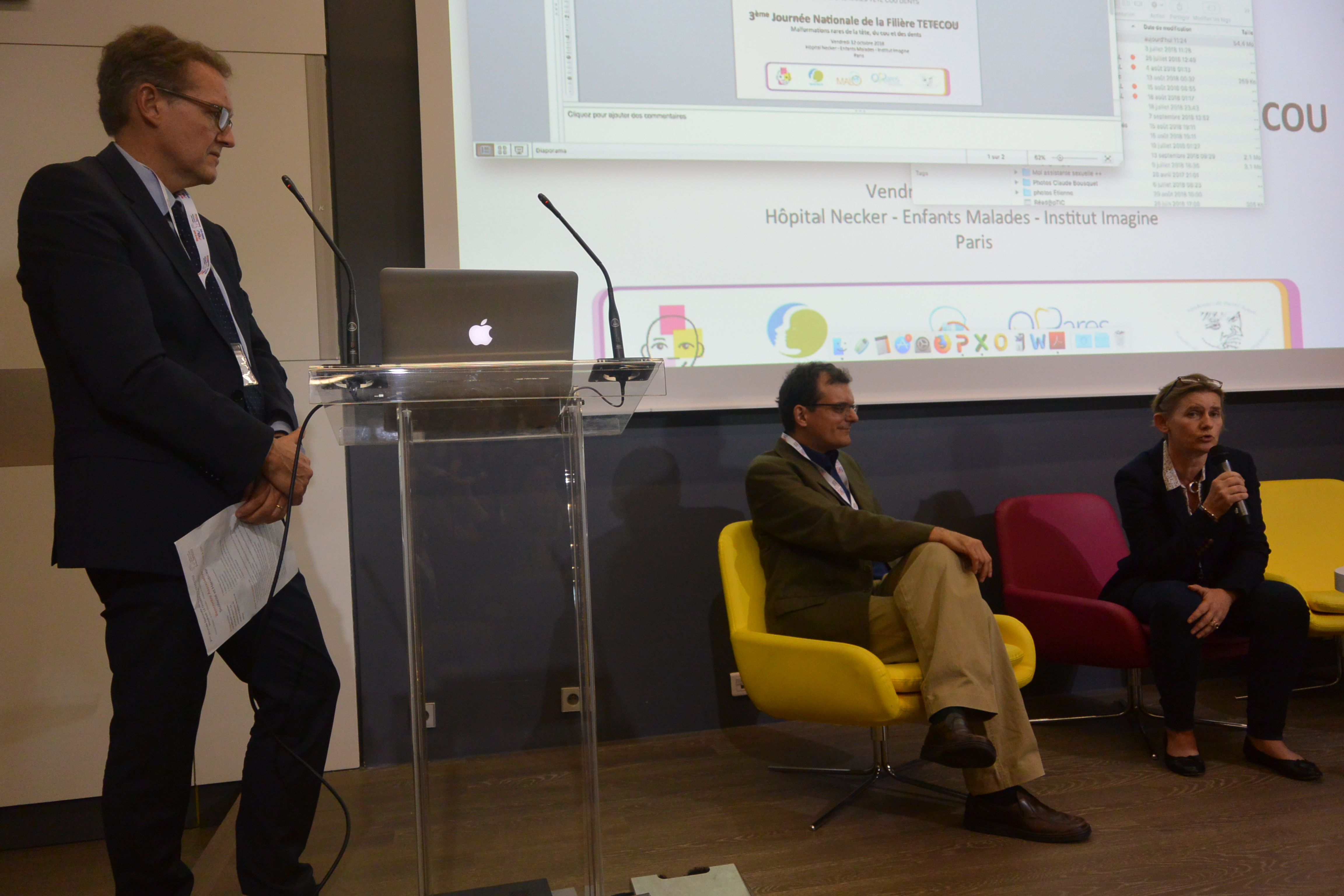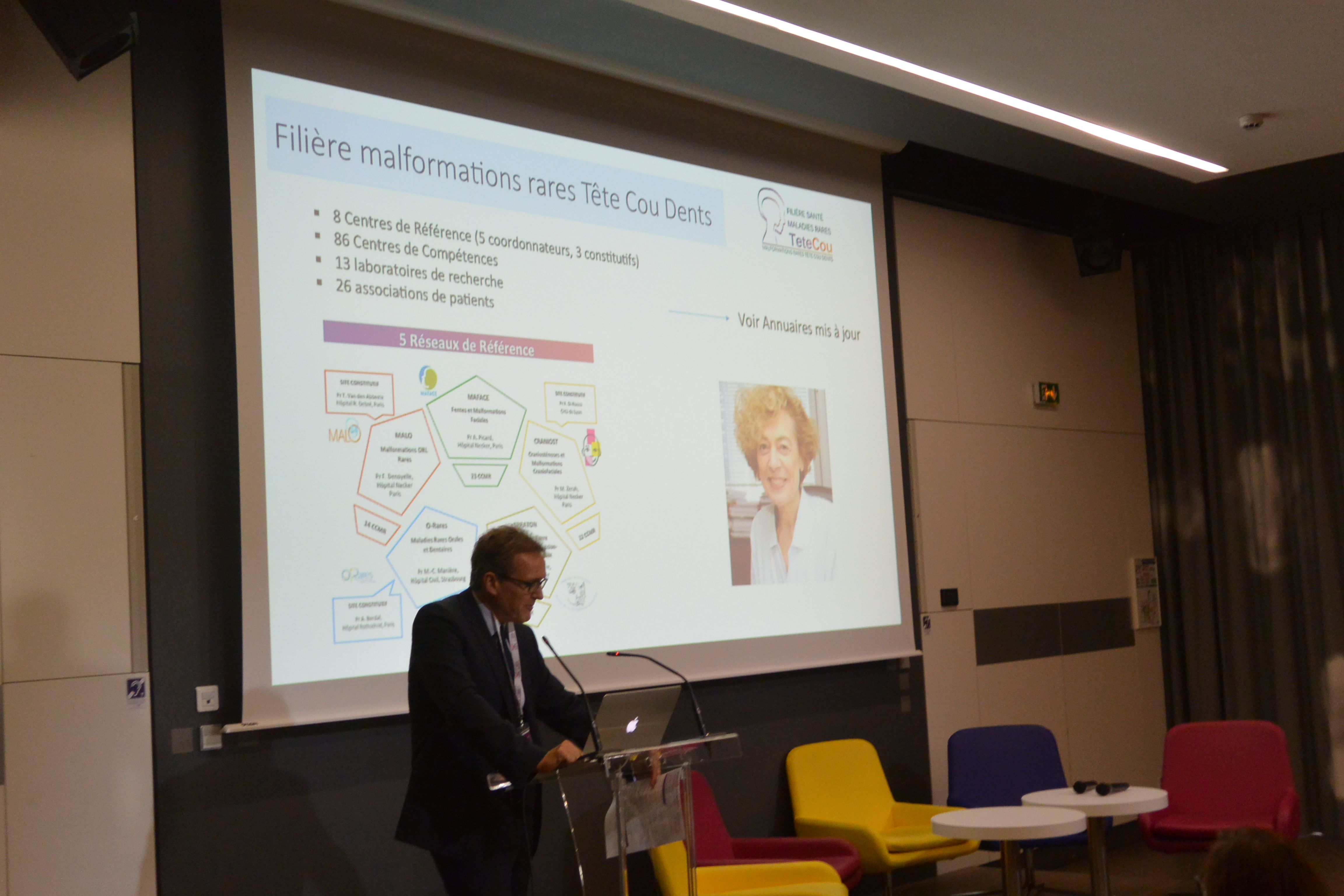 Il a présenté les réseaux de prise en charge de la Filière (dont les coordonnées actualisées sont diffusées dans un livret téléchargeable ici), les actions en cours (détaillées dans un feuillet mis à disposition et consultable ici), parmi lesquelles la mise en place d'un nouveau site Internet, et le Réseau Européen de Référence CRANIO (voir le feuillet dédié ici).