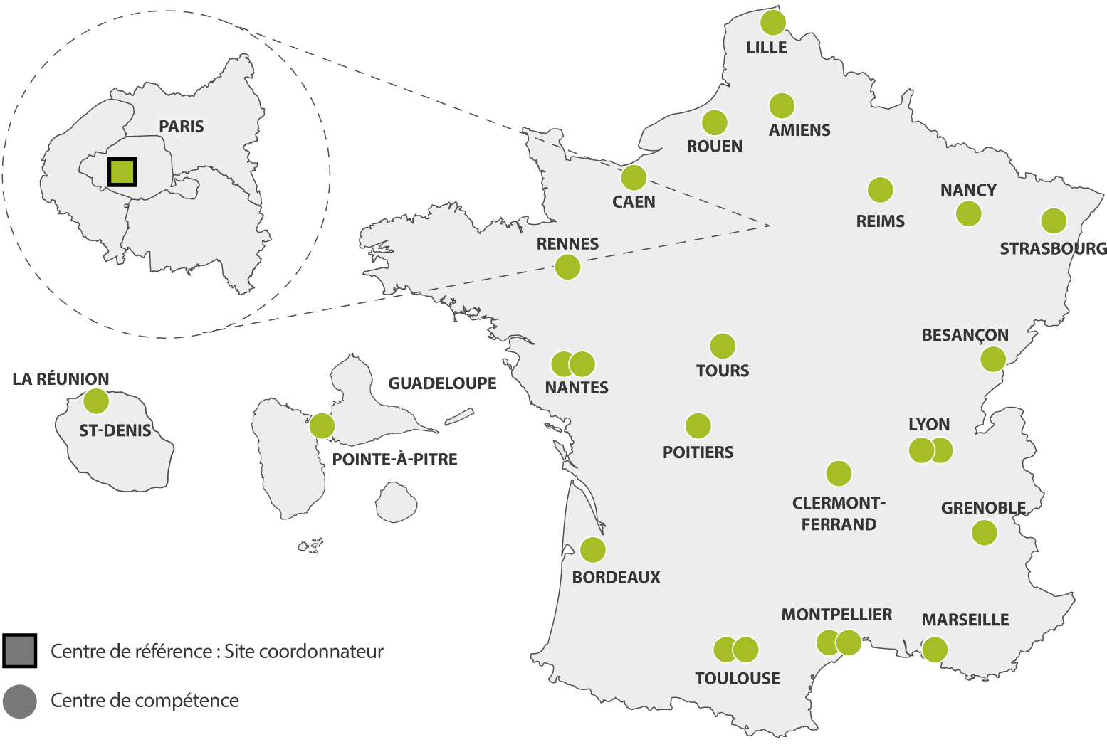 Le Centre de Référence est composé d'un site coordonnateur (Paris - Hôpital Necker) et de 25 Centres de Compétence répartis sur tout le territoire.