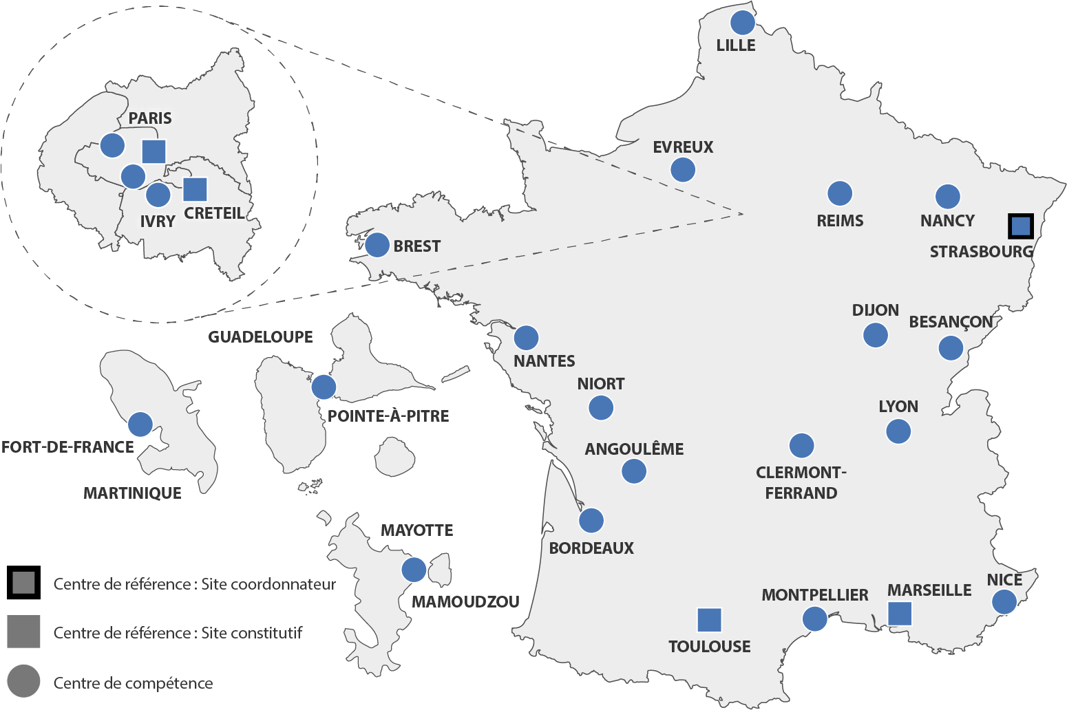 Le Centre de Référence est composé d'un site coordonnateur (Strasbourg - Hôpital Civil), de 4 sites constitutifs (Paris - Hôpital Rothschild, Marseille - Hôpital de La Timone, Créteil - Hôpital Henri Mondor, Toulouse - Hôpital Rangueil) et de 21 Centres de Compétence répartis sur tout le territoire.