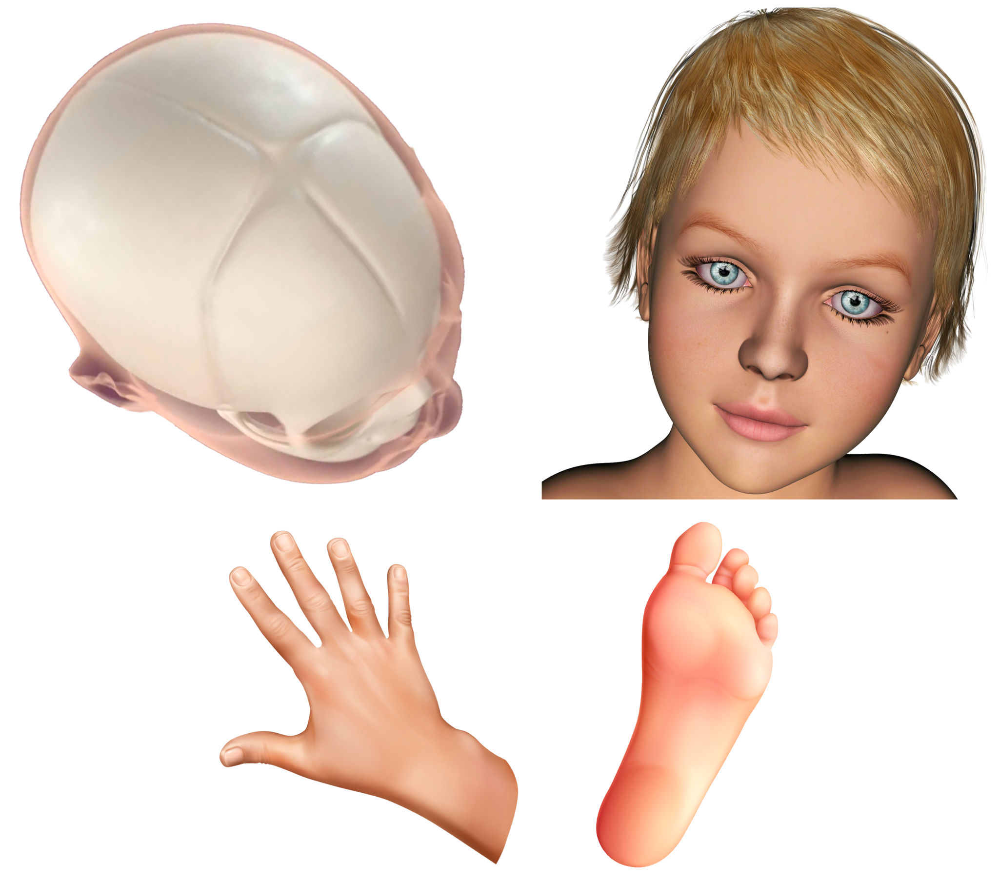 Crédits : Filière TETECOU et CRMR CRANIOST (crâne), Piotr Siedlecki - licence Creative Commons (visage), Freepik.com (main, pied)