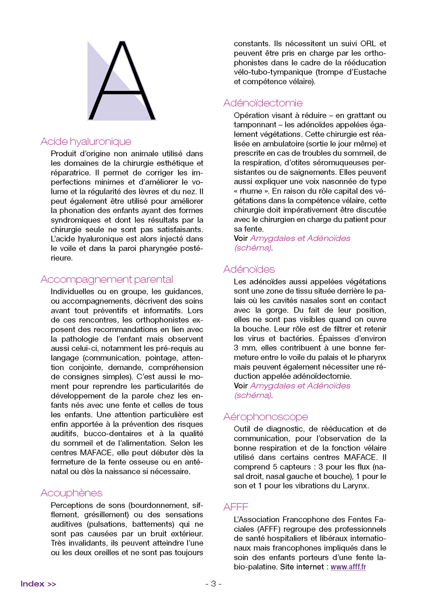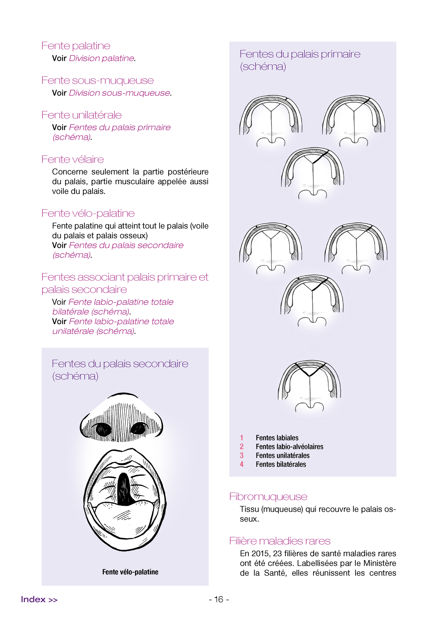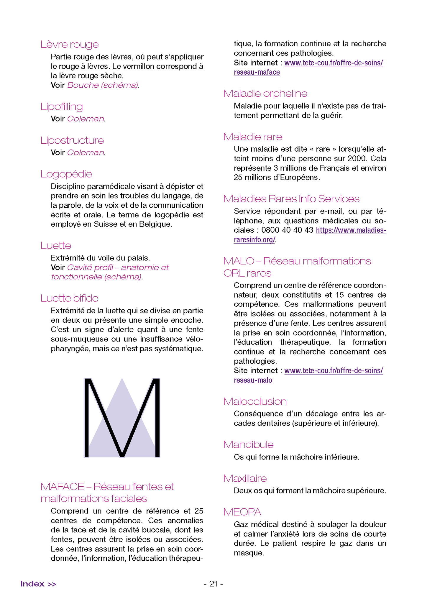 Un dictionnaire numérique a été réalisé par le Centre de Référence des Fentes et Malformations Faciales (MAFACE). A destination de tout public, il comprend plus de 300 définitions de termes médicaux et paramédicaux utilisés dans le traitement et le suivi des patients nés avec une fente labio-palatine.