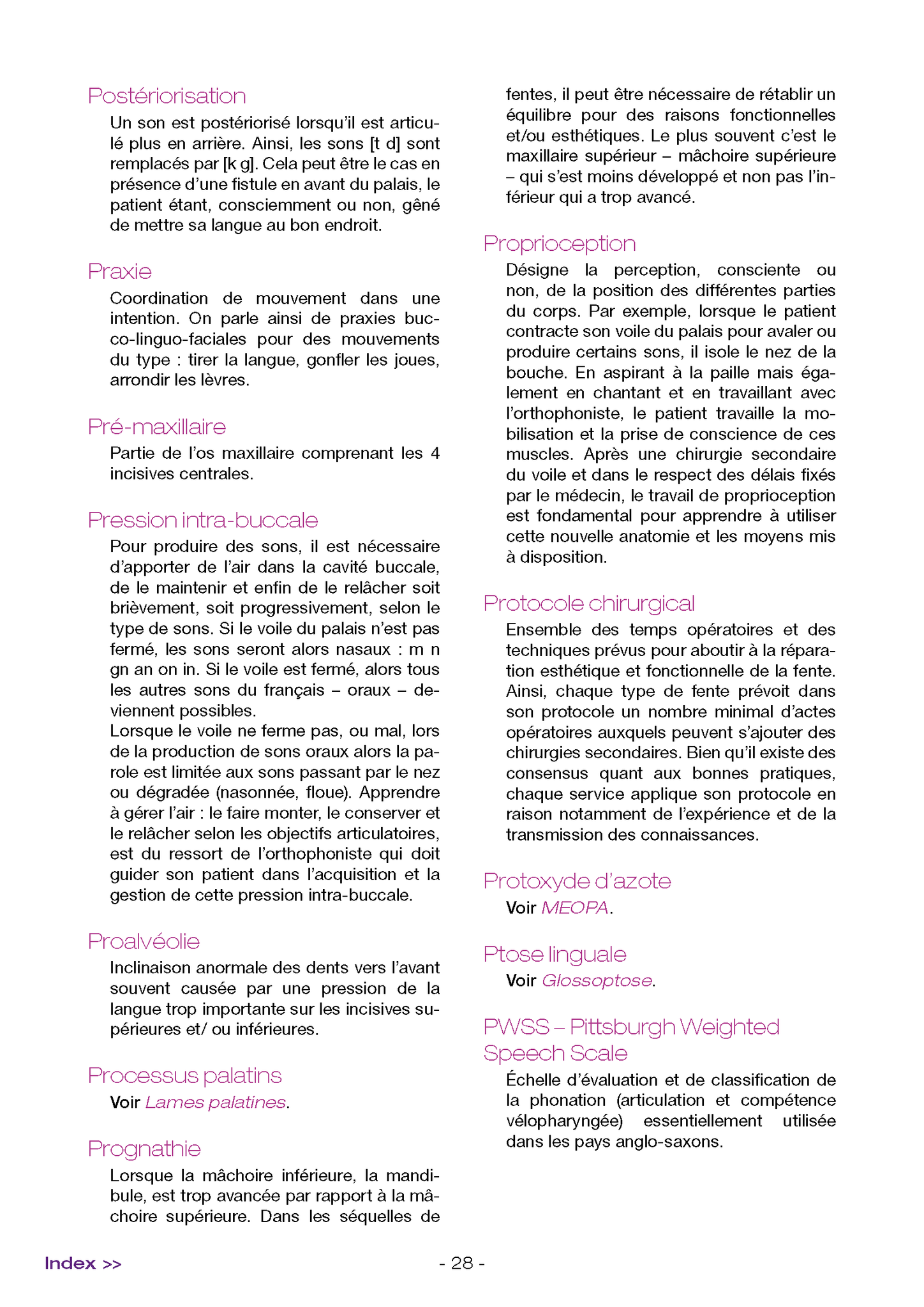 Le dictionnaire contient des termes médicaux, chirurgicaux, orthophoniques ou orthodontiques pouvant être utilisés lors de consultations ou dans les compte-rendus envoyés aux familles et aux professionnels de santé.