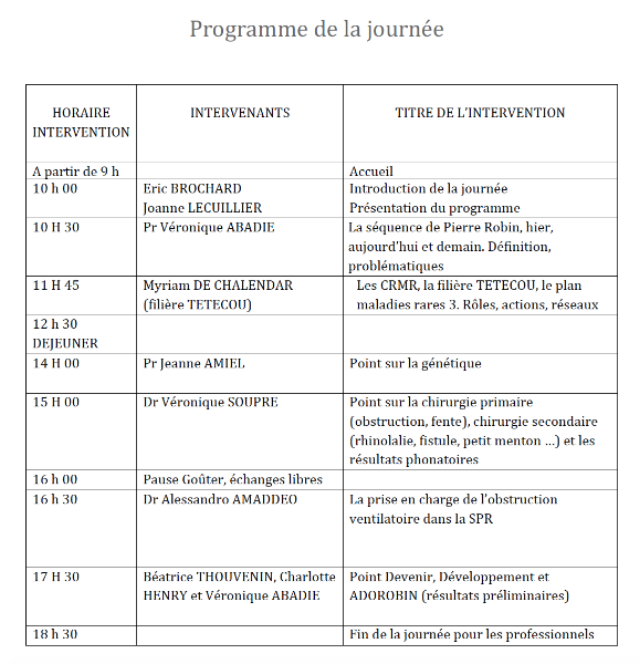 Toute la journée, les professionnels du Centre de Référence "Syndromes de Pierre Robin et Troubles de succion-déglutition congénitaux" (SPRATON) et de la Filière TETECOU ont présenté les avancées de la prise en charge et de la recherche, et ont répondu aux nombreuses questions des familles.