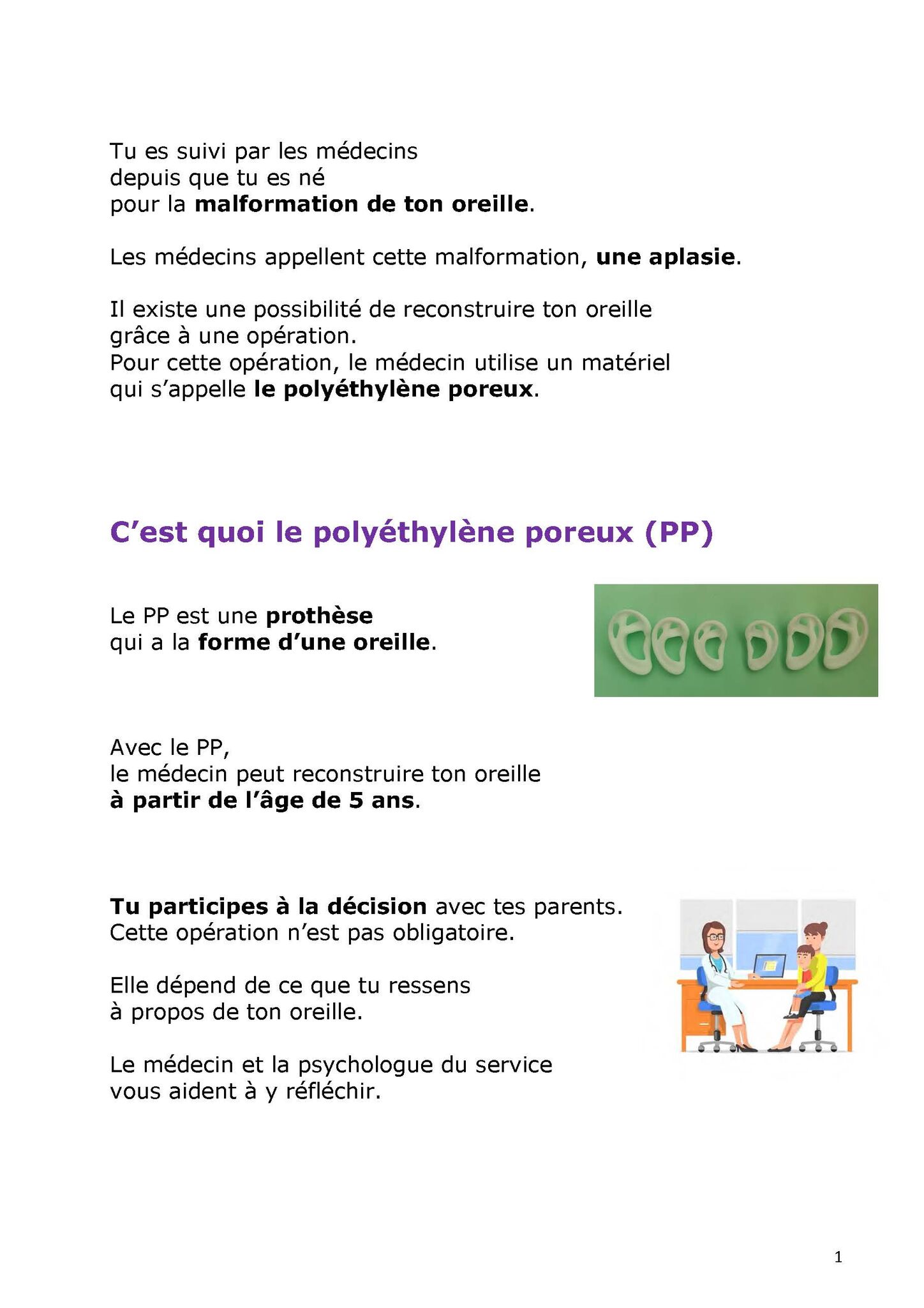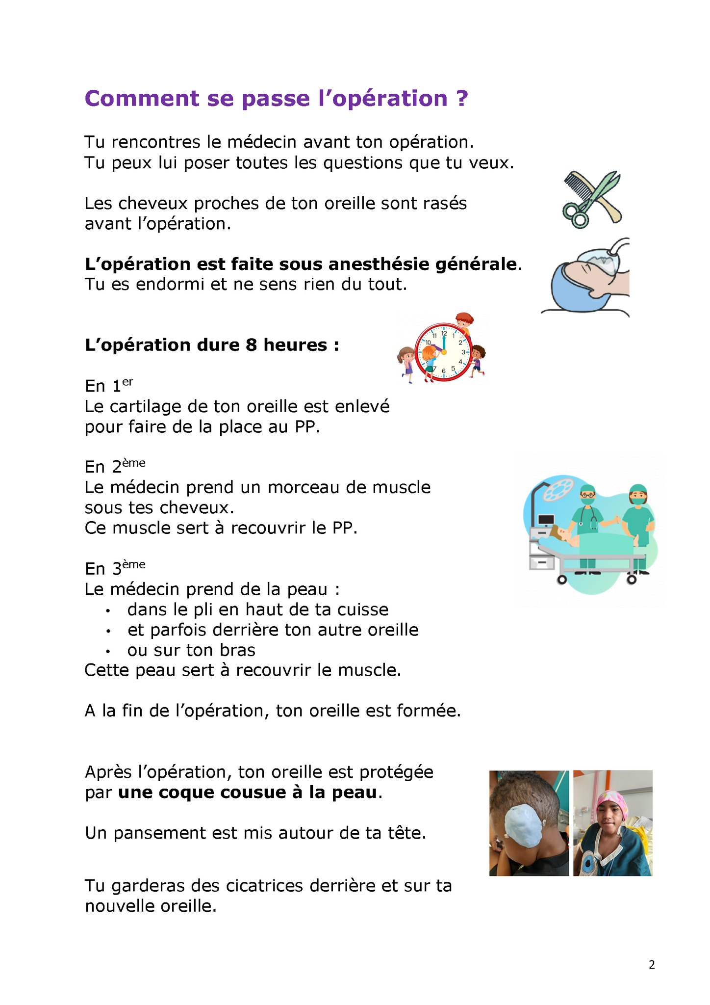 Afin d'expliquer la chirurgie de reconstruction d'oreille par polyéthylène poreux aux enfants porteurs d'une aplasie d'oreille, le Centre de Référence des Malformations ORL Rares (MALO) de l'Hôpital Necker a élaboré un livret illustré d'informations en FALC (Facile A Lire et A Comprendre), en collaboration avec l'équipe de la Filière TETECOU.