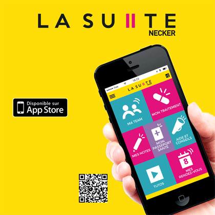 L’application mobile « La Suite Necker » est destinée aux adolescents et aux jeunes adultes porteurs d’une maladie rare et/ou chronique afin de leur permettre de mieux vivre avec leur maladie et gagner en autonomie.