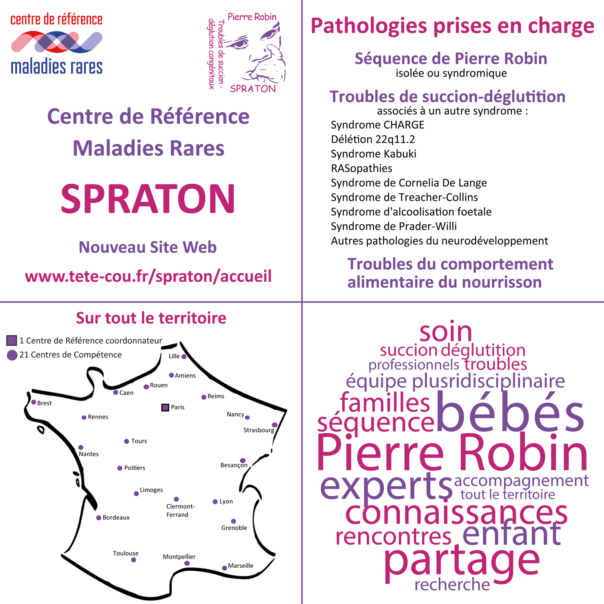 Que vous soyez professionnel de santé, parent ou simplement interessé par la prise en charge de ces pathologies, il vous est possible de consulter ce site Internet afin d'en connaître davantage sur les missions et actions des Centres du réseau SPRATON.