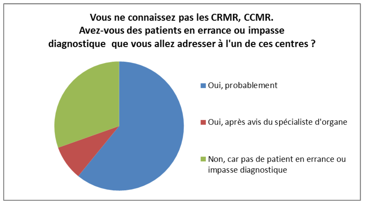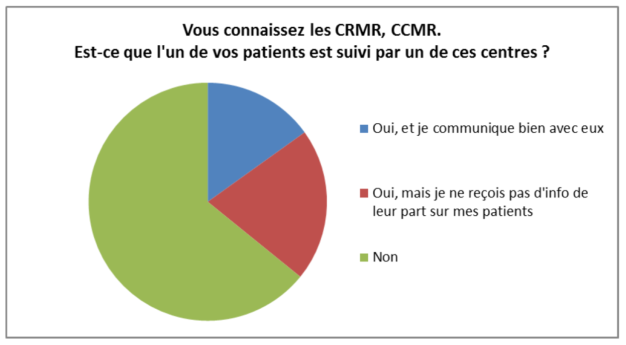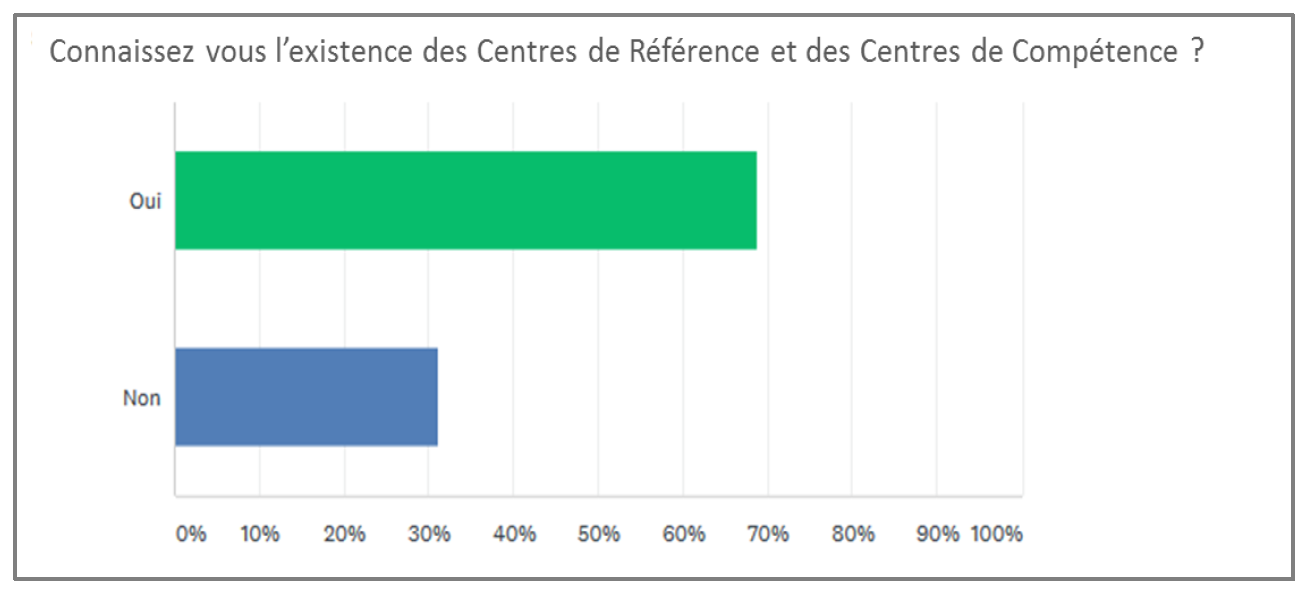 Près de 70% connaissent la structuration en Centres de Référence et Centres de Compétence, même s'ils n'ont pour la plupart pas d'échange avec eux. Ceux qui ne les connaissaient pas sont très intéressés et vont probablement leur adresser des patients.