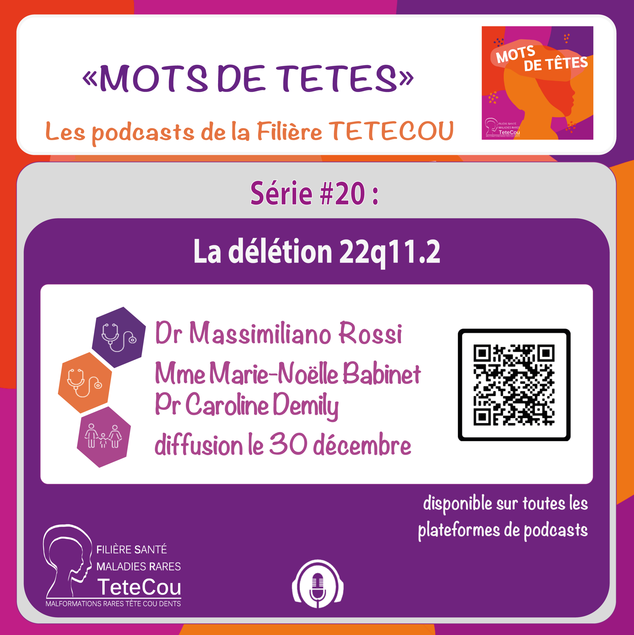 Des podcasts pour faire découvrir et informer sur les malformations de la tête, du cou et des dents, leurs conséquences, leurs prises en charge, la recherche, le vécu des personnes malades et de leurs familles, l'accompagnement proposé par les Associations.