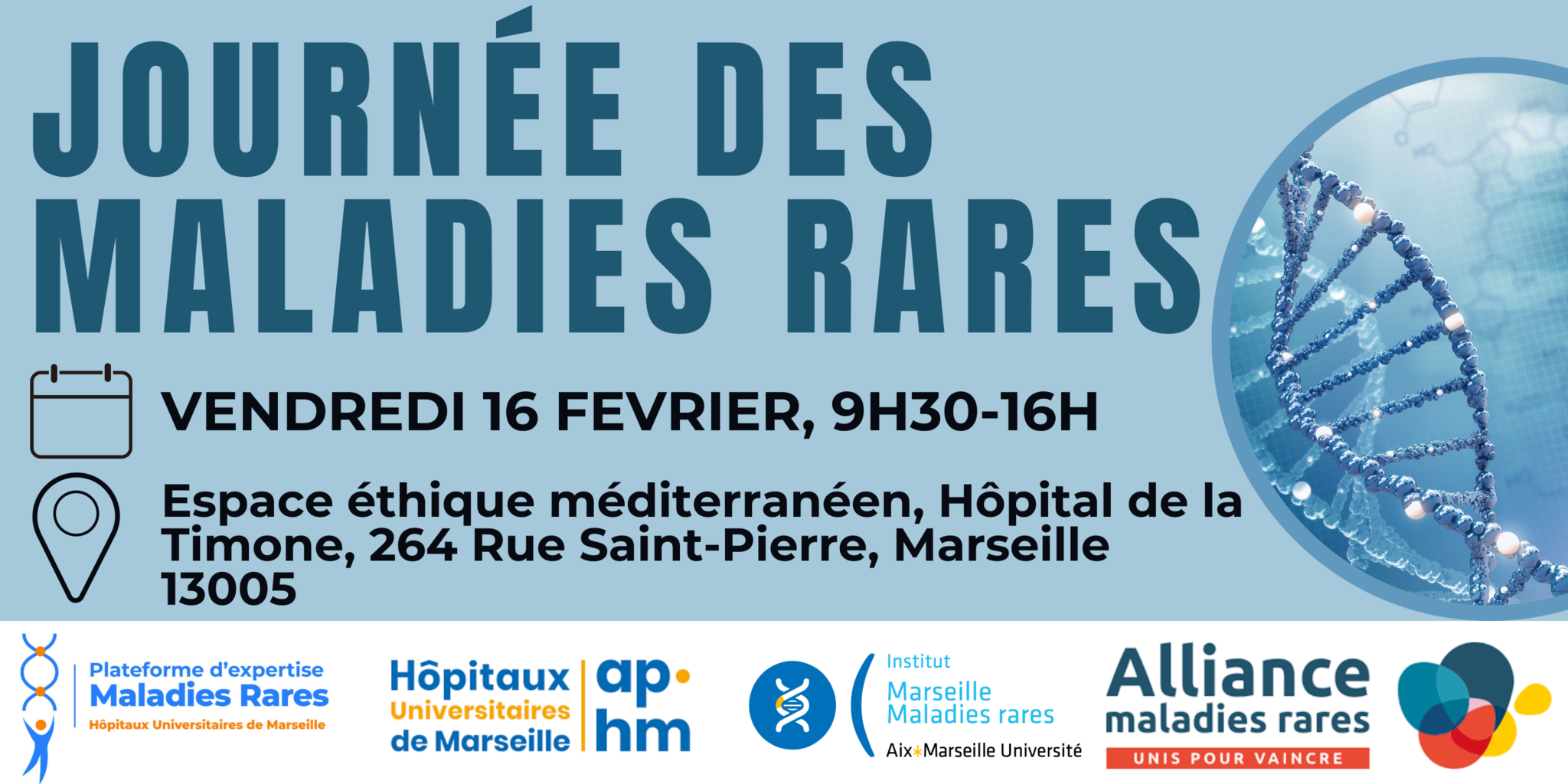 La Plateforme d'Expertise Maladies Rares de l'AP-HM, l'institut Marseille Maladies Rares (MarMaRa) et l'Alliance Maladies Rares PACA organisent une journée maladies rares autour d'interventions et de stands qui seront une opportunité de rencontres entre médecins, chercheurs et patients et de sensibilisation autour des maladies rares.