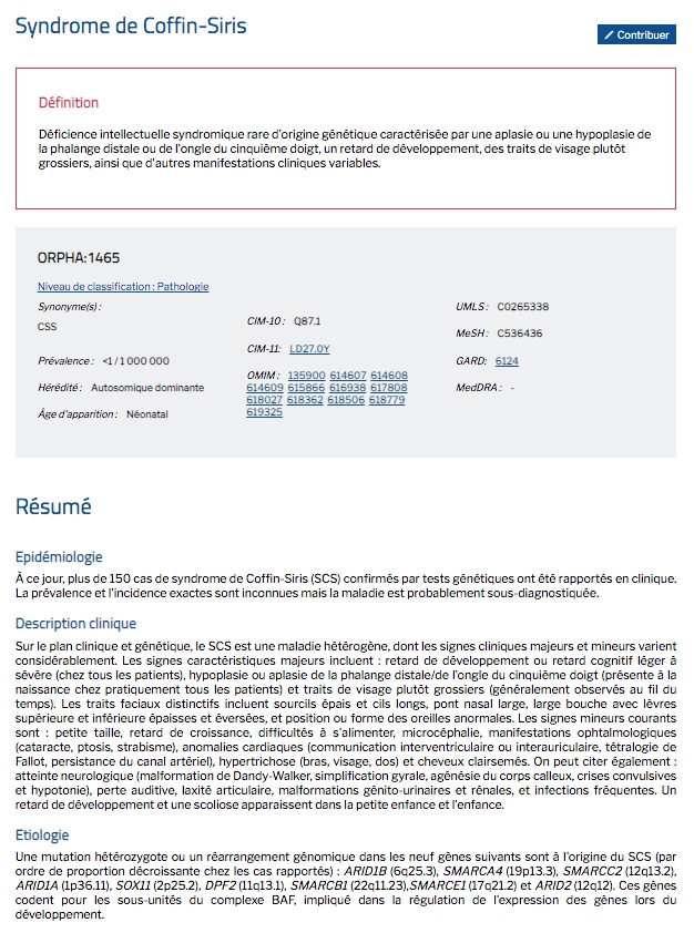 La prévalence à la naissance du syndrome de Coffin-Siris est estimée inférieure à 1/1 000 000.