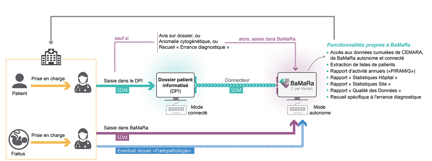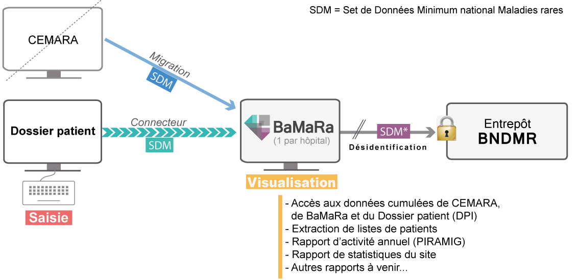 Les Centres Maladies Rares recueillent un jeu de données communes (le set de données minimum) pour tous leurs patients afin de collecter les informations démographiques, géographiques, diagnostiques et de prise en charge. Ce recueil peut être réalisé de différentes manières : via une application accessible sur Internet (CEMARA puis BaMaRa), par l'intermédiaire d'une fiche maladies rares dans les logiciels hospitaliers (dossiers patients informatisés) ou par connexion avec des bases de données existantes.