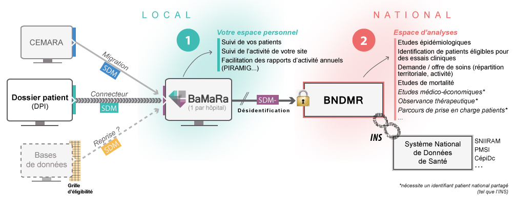 Les données collectées sont anonymisées et dédoublonnées avant d'être transférées dans un entrepôt national de données, l'entrepôt BNDMR.