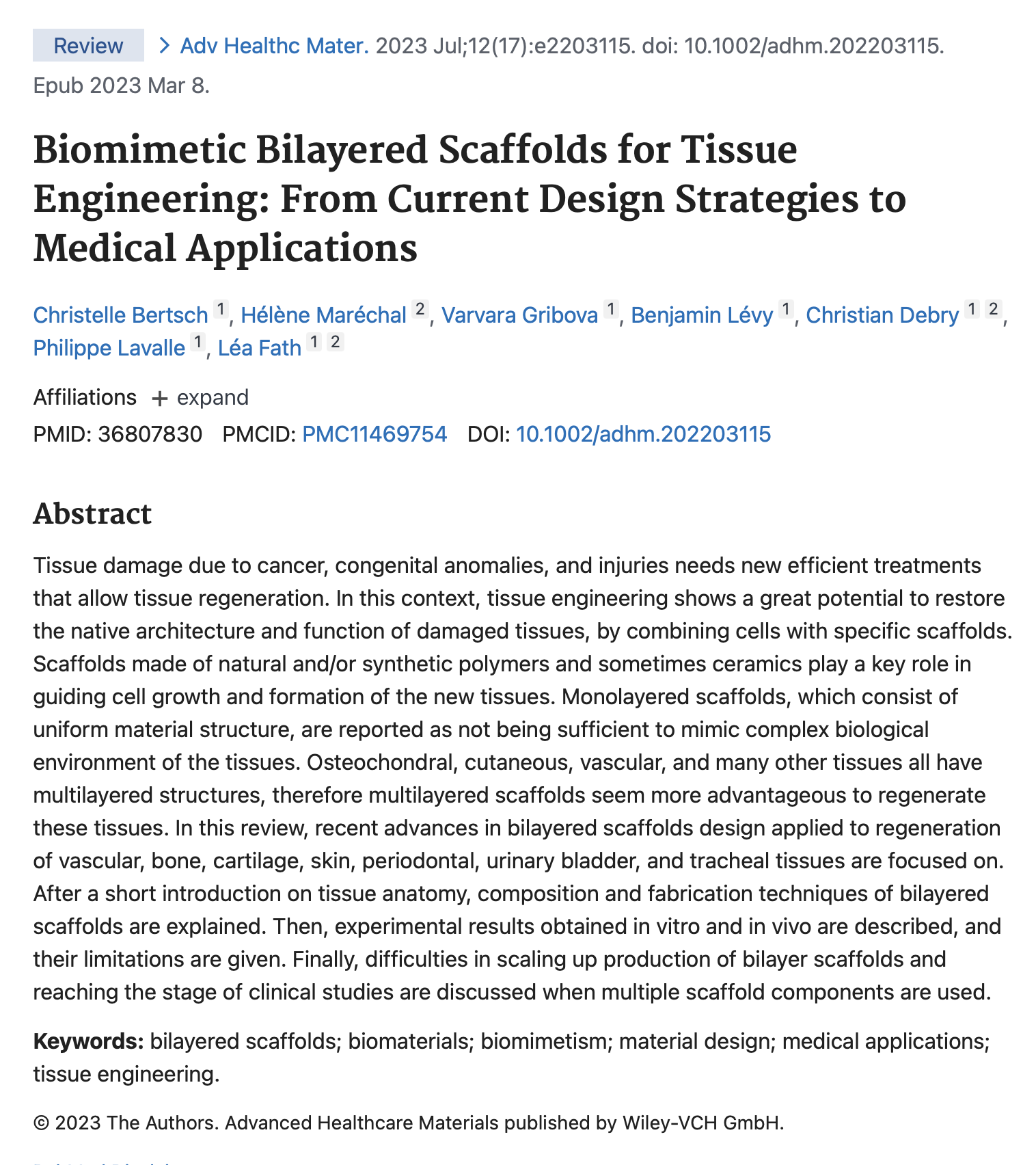 - l'ingénierie tissulaire dentaire et notamment la régénération de la pulpe dentaire. Pour cela deux points sont essentiels : favoriser la prolifération et la différenciation cellulaire locale et disposer d’un pouvoir antibactérien. Nous proposons deux approches : la formation de membranes fibreuses électrospinnées fonctionnalisées par l’acide tannique et l’utilisation de matrice extracellulaire issue de la gelée de Wharton (cordon ombilical).