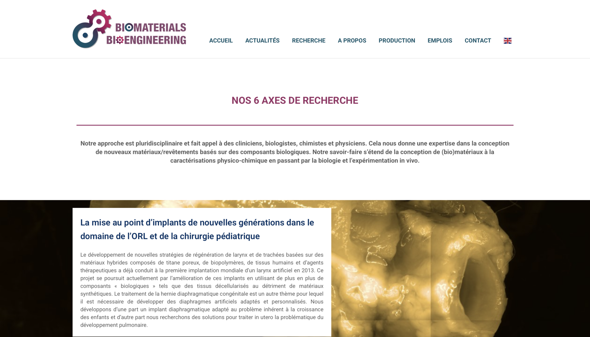 - la mise au point d’implants de nouvelles générations dans le domaine de l’ORL et de la chirurgie pédiatrique. Le traitement de la hernie diaphragmatique congénitale est un thème pour lequel il est nécessaire de développer des diaphragmes artificiels adaptés et personnalisés. Nous développons d’une part un implant diaphragmatique adapté au problème inhérent à la croissance des enfants et d’autre part nous recherchons des solutions pour traiter in utero la problématique du développement pulmonaire