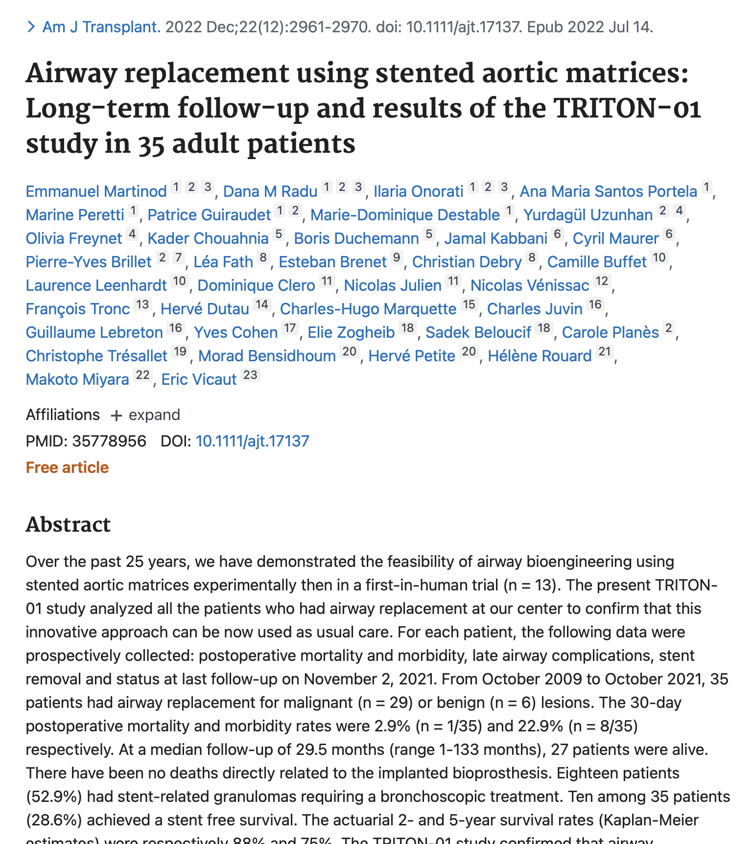 One of the thematic axes studies the processes of repair, regeneration and replacement of lung tissue, alveoli and large airways. Indeed, the thoracic surgeons of the Unit (head: Emmanuel Martinod) are pioneers in extended tracheal replacement by cryopreserved aortic matrix allograft, the only technique currently effective in humans. The objectives are: