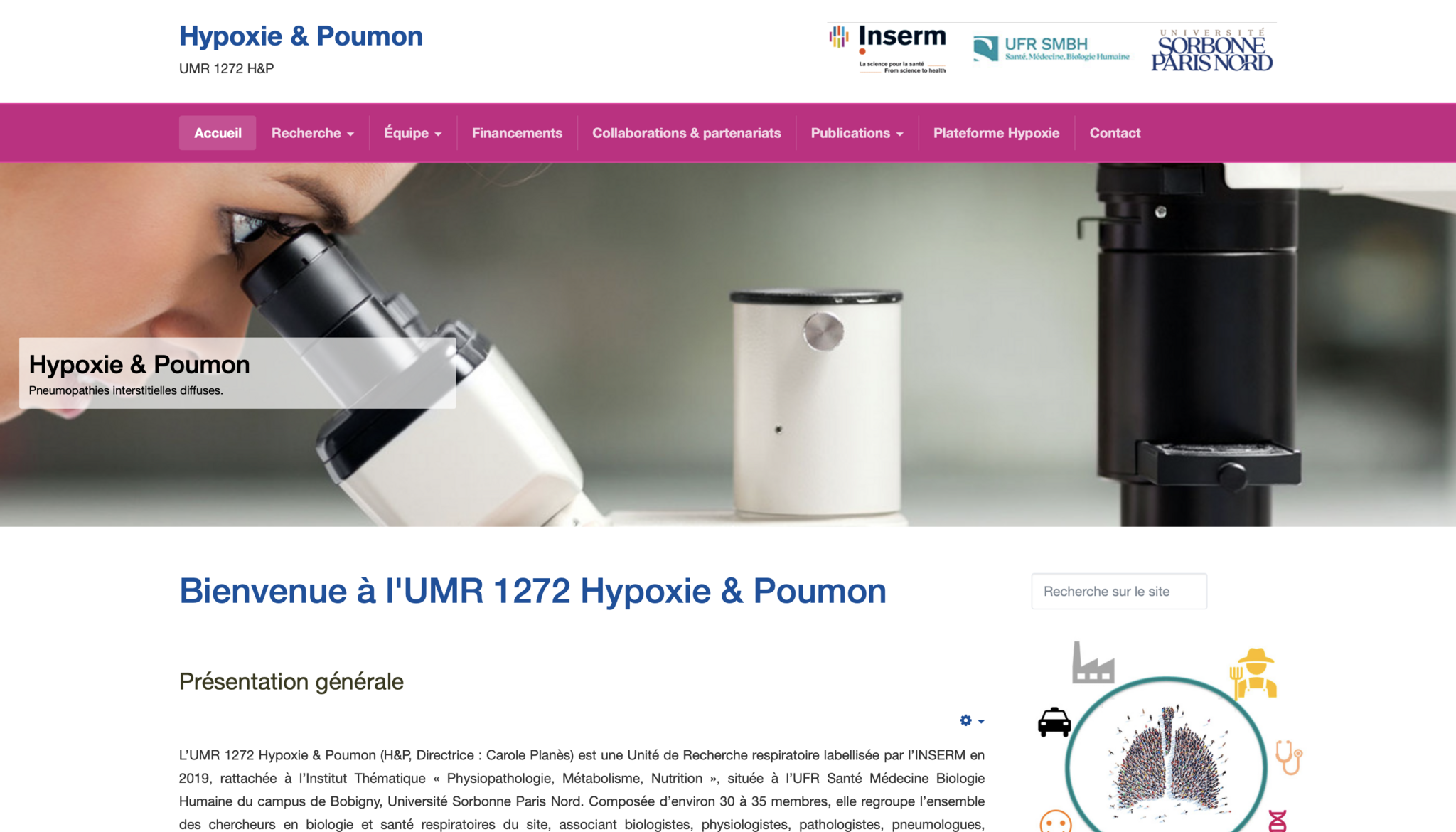 UMR 1272 Hypoxia & the Lung (H&P, Director: Carole Planès) is a Respiratory Research Unit accredited by INSERM in 2019, attached to the Thematic Institute "Physiopathology, Metabolism, Nutrition", located at the UFR Health Medicine Human Biology of the Bobigny campus, Sorbonne Paris Nord University. Composed of approximately 30 to 35 members, it brings together all the researchers in respiratory biology and health on the site, associating biologists, physiologists, pathologists, pulmonologists, radiologists and thoracic surgeons.
